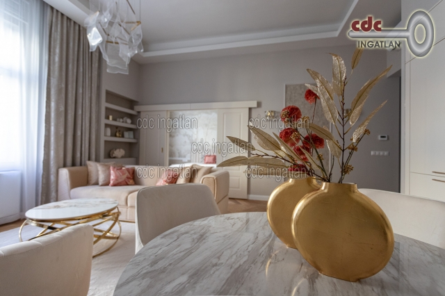 Belvárosi elegáns, exkluzív luxuslakás eladó! V. kerületben, a Nyáry Pál utcában, a Váci utca szomszédságában, III. emeleti, 89 m2-es nappali + 2 hálószobás, duplakomfortos, vendég wc-s, luxuslakás eladó. Az ingatlan prémium minőségű felújításon esett át, melynek során a legkiválóbb minőségű anyagokat használták fel, a lakás minden részletében az eleganciát tükrözi. Az ingatlan amerikai konyhás nappalival rendelkezik, a fő hálószoba és a nappali a csendes Nyáry Pál utcára néz, míg a második hálószoba a nyugodt belső udvarra nyílik. Mindkét hálószobához külön fürdőszoba tartozik, a fő hálószobához egy elegáns káddal, WC-vel és bidével felszerelt fürdő kapcsolódik, míg a második hálószobához egy modern zuhanyzós. A lakásban külön vendég WC is található. Az ingatlan prémium minőségű bútorokkal és gépekkel együtt eladó, így az új tulajdonos azonnal beköltözhet egy teljesen felszerelt, exkluzív otthonba. A teljes körű felújítás során új nyílászárók lettek beépítve, valamint minden víz- és villanyvezetékek cserélve lett. Designer csillárok, beépített szekrények, minőségi szaniterek és prémium burkolatok kerültek beépítésre. A 3,6 méteres belmagasság és a chevron tölgyfa parketta különleges, elegáns hangulatot kölcsönöz az otthonnak. A konyha teljesen gépesített, AEG márkájú készülékekkel felszerelt: mosogatógép, hűtő fagyasztóval, sütő, főzőlap, páraelszívó és mosó- szárítógép is rendelkezésre áll. Az ingatlan kényelmét három légkondicionáló és automata redőnyök biztosítják. A fűtés és a melegvíz kondenzációs kazánról üzemel, a közös költség vízdíjat és célbefizetést tartalmaz, melynek összege 42.809.-Ft havonta. Ez a lakás nem csak otthonként, hanem befektetésként is tökéletes választás azok számára, akik a belvárosi luxust és kényelmet keresik. Az ingatlan minden részlete a legmagasabb színvonalat képviseli, így garantáltan megfelel a legigényesebb vásárlók elvárásainak is.